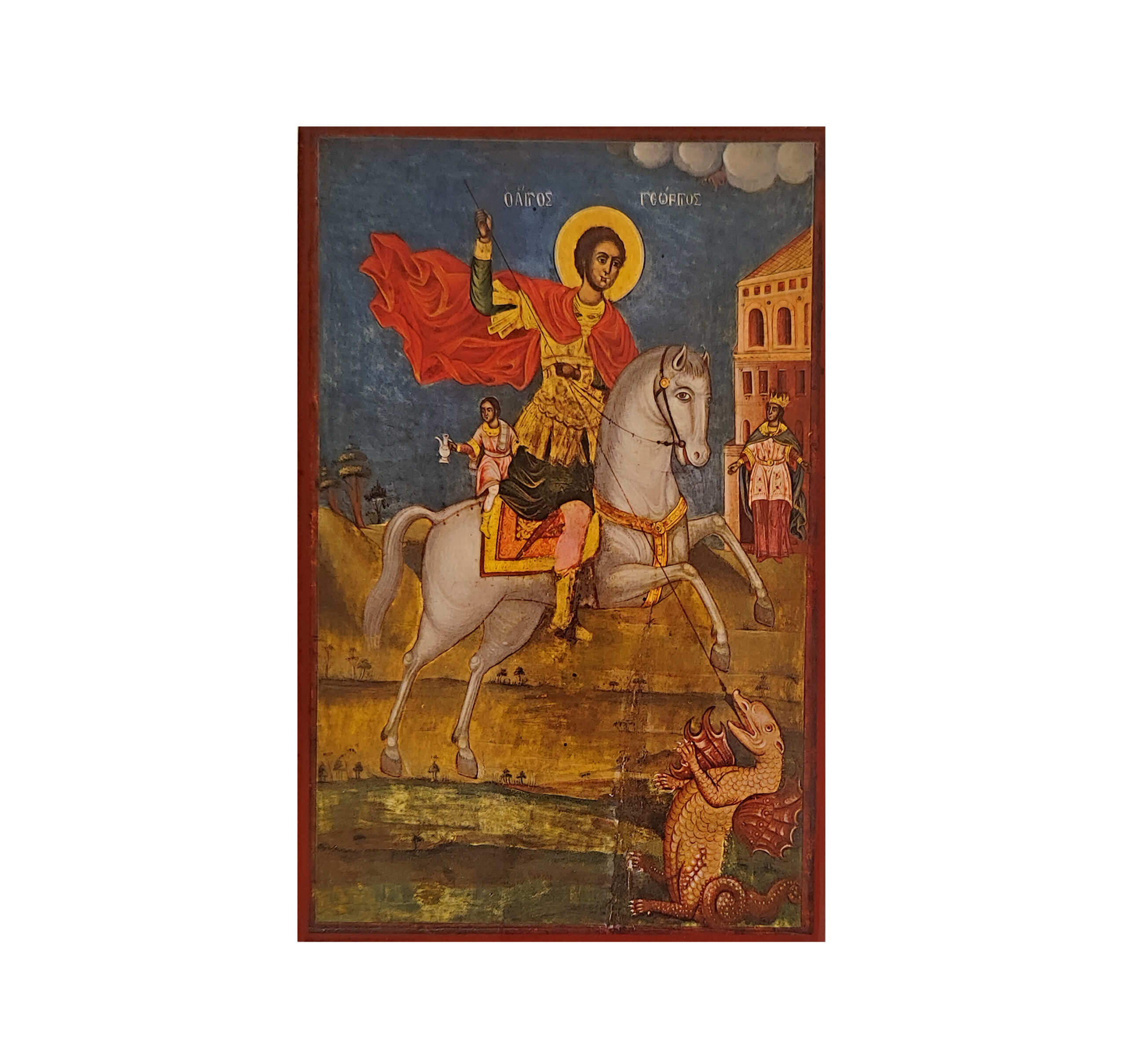 Αντίγραφο εικόνος του 19ου αιώνος σε ξύλο όπου απεικονίζεται ο Άγιος Γεώργιος ο Τροπαιοφόρος ως έφιππος.