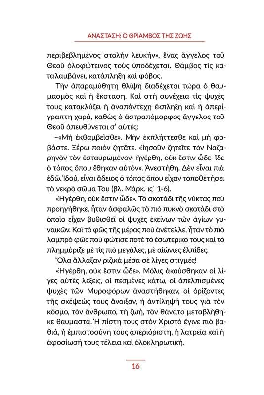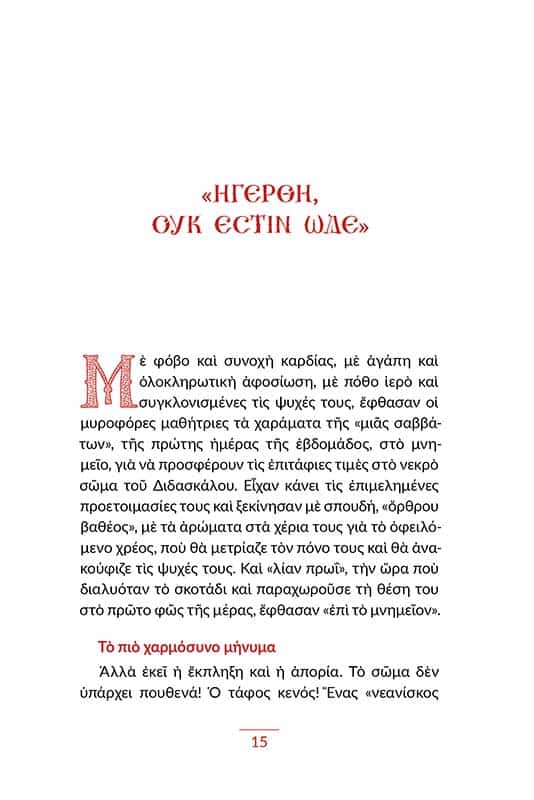 Τα κείμενα του βιβλίου αναλύουν κάποιες πτυχές από τα γεγονότα της Αναστάσεως και μας βοηθούν να εμβαθύνουμε στο λυτρωτικό μήνυμά τους. Με σκοπό να βιώσουμε «την καλήν αλλοίωσιν», τη θαυμαστή μεταβολή, που θα μας δώσει τη δυνατότητα να ζήσουμε ως «της αναστάσεως υιοί» (Λουκ. κ΄ 36) στην άρρητη δόξα και αιώνια χαρά της ουράνιας Βασιλείας του Θεού.