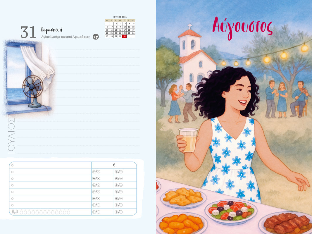 Η πρωτότυπη ημερήσια ατζέντα, που αγαπήθηκε από χιλιάδες γυναίκες και έγινε καθημερινή συνήθεια κυκλοφορεί και για το 2026. Είναι ειδικά σχεδιασμένη για τον τρόπο ζωής της σύγχρονης γυναίκας, που συνδυάζει ταυτόχρονα πολλές ιδιότητες. Είναι ημερήσια, με μεγάλους χώρους για σημειώσεις και παρακολούθηση καθημερινών συνηθειών, καθημερινό οικονομικό προγραμματισμό, ενώ περιέχει και μηνιαίο προγραμματισμό. Το σπιράλ δέσιμο και το σκληρό της εξώφυλλο εξασφαλίζουν ευκολία στο γράψιμο, αλλά και εξαιρετική ανθεκτικότητα στη συχνή χρήση. Περιέχονται και αυτοκόλλητα με την εικονογράφηση. Με σύνθημα «Μια χρονιά με όλα όσα αγαπάς» είναι εμπνευσμένη από την πολύπλευρη ζωή της ελληνίδας γυναίκας και αποτυπώνεται στην εικονογράφηση, αλλά και στα μικρά πρωτότυπα κείμενα. Από την πολύβουη πόλη, μέχρι την ησυχία του φθινοπωρινού βουνού και από τα παραδοσιακά πανηγύρια, μέχρι τις στιγμές θαλπωρής στο σπίτι, η σημερινή γυναίκα βρίσκει πτυχές του εαυτού της σε κάθε σελίδα της Ατζέντας.