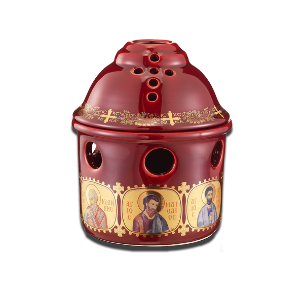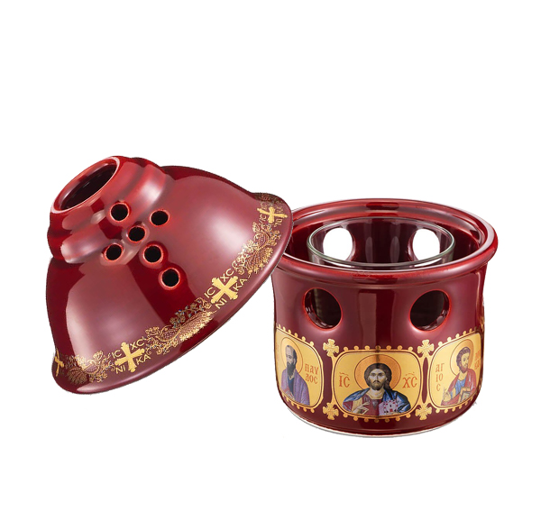 Επιτραπέζιο κεραμικό καντήλι σε μπορντώ χρώμα με παραστάσεις Αγίων και του Κυρίου φτιαγμένες με την μέθοδο της χρυσοτυπίας.