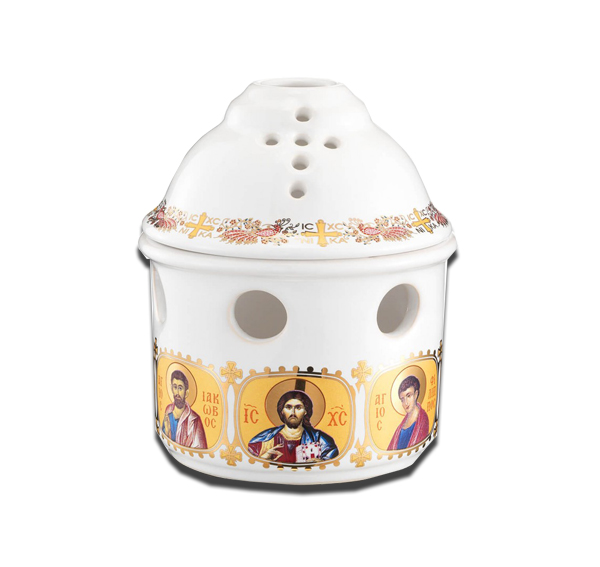 Επιτραπέζιο κεραμικό καντήλι σε λευκό χρώμα με παραστάσεις Αγίων και του Κυρίου φτιαγμένες με την μέθοδο της χρυσοτυπίας.