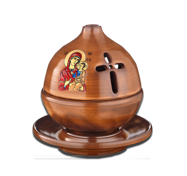 Επιτραπέζιο κεραμικό καντήλι σε σχήμα θόλου, με πιατάκι σε καφέ απόχρωση, διακοσμημένο με την εικόνα της Θεομήτωρος.