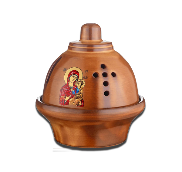 Επιτραπέζιο κεραμικό καντήλι σε σχήμα θόλου, σε καφέ απόχρωση, διακοσμημένο με την εικόνα της Θεομήτωρος.