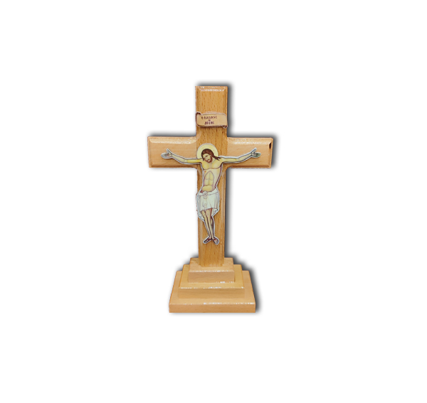 Σταυρός ξύλινος επιτραπέζιος με τον Εσταυρωμένο 14 εκατοστών, σε φυσικό χρώμα ξύλου.