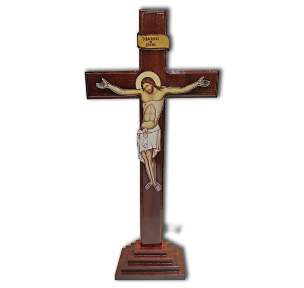 Σταυρός ξύλινος επιτραπέζιος με τον Εσταυρωμένο 44 εκατοστών, σε χρώμα κερασιάς.