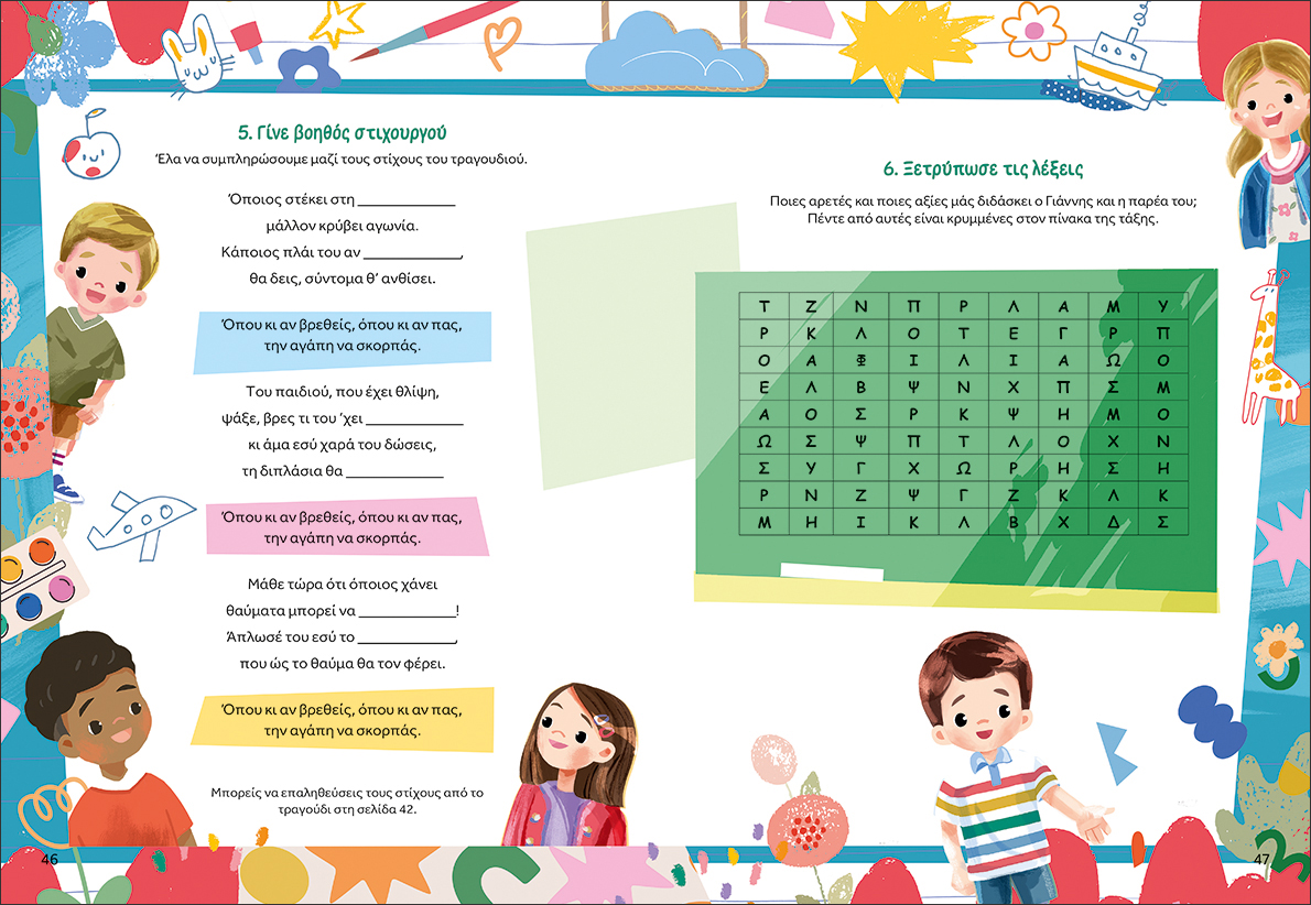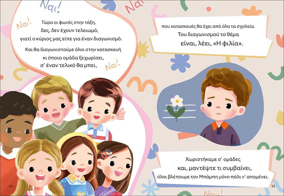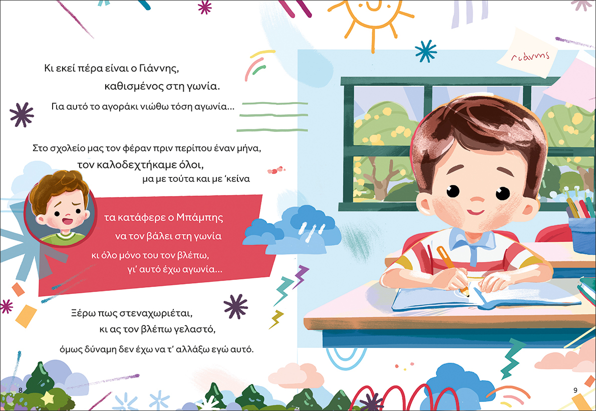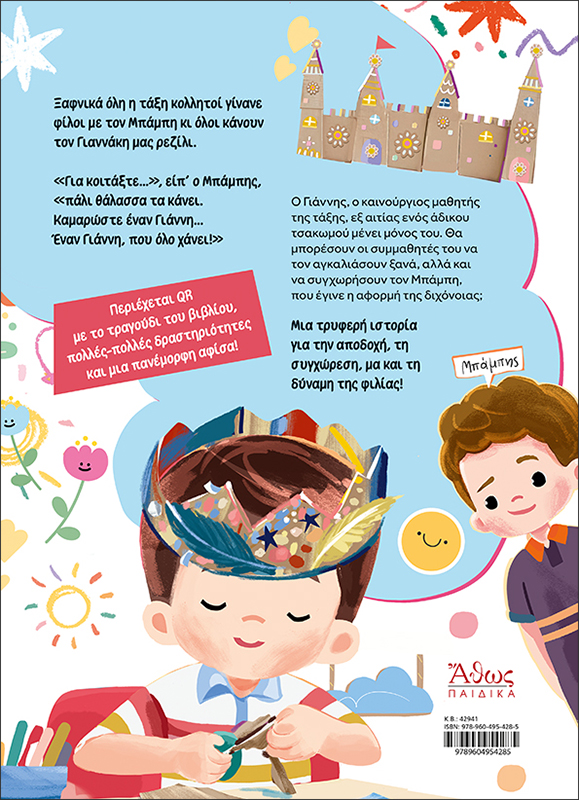 Μια τρυφερή ιστορία για μικρότερα παιδιά για την δύναμη της φιλίας, την αποδοχή των άλλων, την αληθινή συγχώρεση και την ομορφιά της συνεργασίας. Στην τάξη ήρθε ένας νέος μαθητής, ο Γιάννης. Μα ο Μπάμπης αποφάσισε πως δεν τον θέλει για φίλο και λόγω ενός άδικου τσακωμού, ο Γιάννης μένει μόνος του. Θα βρουν λύση οι υπόλοιποι συμμαθητές; Τι θα συμβουλεύσει ο δάσκαλος με αγάπη τα παιδιά; Το έμμετρο κείμενο υπογράφει η Σοφία Γκοτζαμάνη και την πανέμορφη εικονογράφηση η Αγγελική Δελεχά. Το βιβλίο περιλαμβάνει πολλές δραστηριότητες, μια πανέμορφη αφίσα για το δωμάτιο ή και την τάξη, καθώς και QR με το τραγούδι του βιβλίου.
