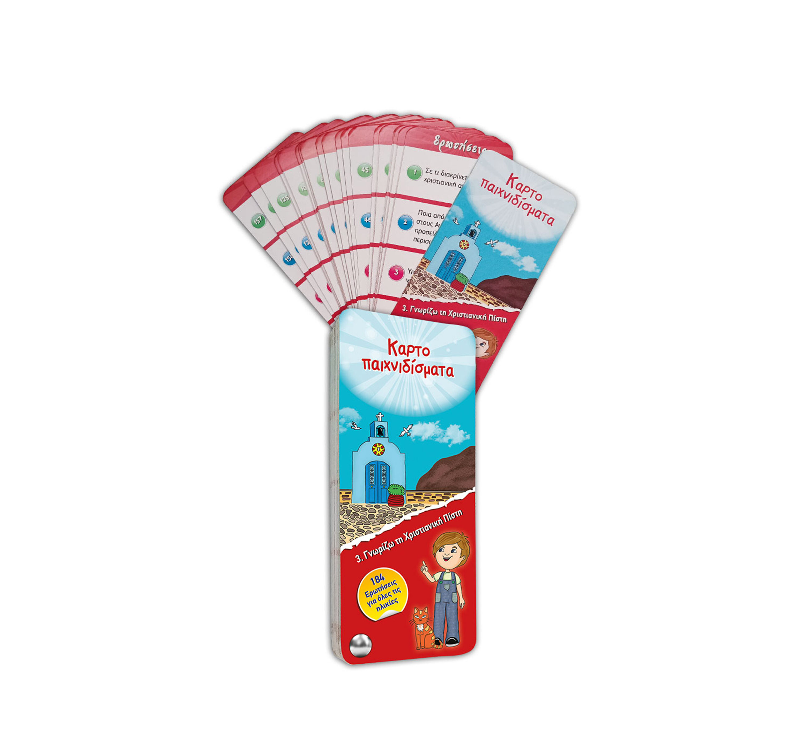 Δοκίμασε και εμπλούτισε τις γνώσεις σου µε ευχάριστο τρόπο πάνω στην ιστορία, τη ζωή και την παράδοση της Εκκλησίας µας. Παίξε µόνος σου ή µε την παρέα σου. Διάλεξε µία κάρτα στην τύχη. Προσπάθησε να απαντήσεις στις ερωτήσεις που σου κάνουν, κι έπειτα αλλάξτε ρόλους.