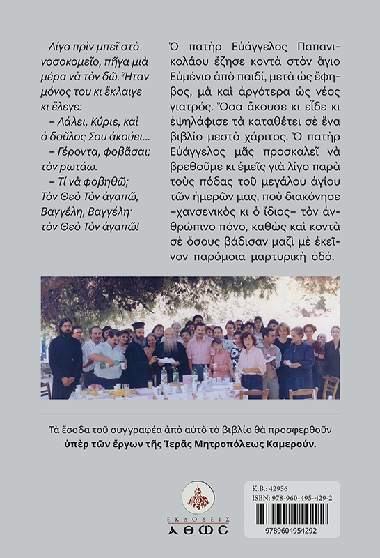 Ένα πολύτιμο βιβλίο του σεβαστού πατρός Ευάγγελου Παπανικολάου, ιατρού και ιεραποστόλου. Ο συγγραφέας όταν ήταν ακόμα παιδί, μόλις 12 ετών, είχε την ευλογία να συναντήσει για πρώτη φορά τον άγιο Ευμένιο Σαριδάκη στο Νοσοκομείο Λοιμωδών Αττικής. Και δεν έφυγε ποτέ από το πλάι του. Πέρασε τα παιδικά, εφηβικά και νεανικά του χρόνια παρά τους πόδας του μεγάλου αυτού αγίου των ημερών μας και παρακολούθησε από κοντά την οσιακή του βιωτή μέχρι και την κοίμησή του, όταν ο ίδιος πια ήταν νέος γιατρός. Το βιβλίο περιέχει και φωτογραφικό ένθετο. Τα έσοδα του συγγραφέα θα διατεθούν υπέρ των έργων της Ιεράς Μητροπόλεως Καμερούν.