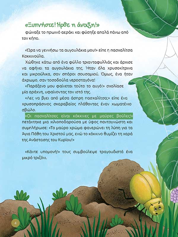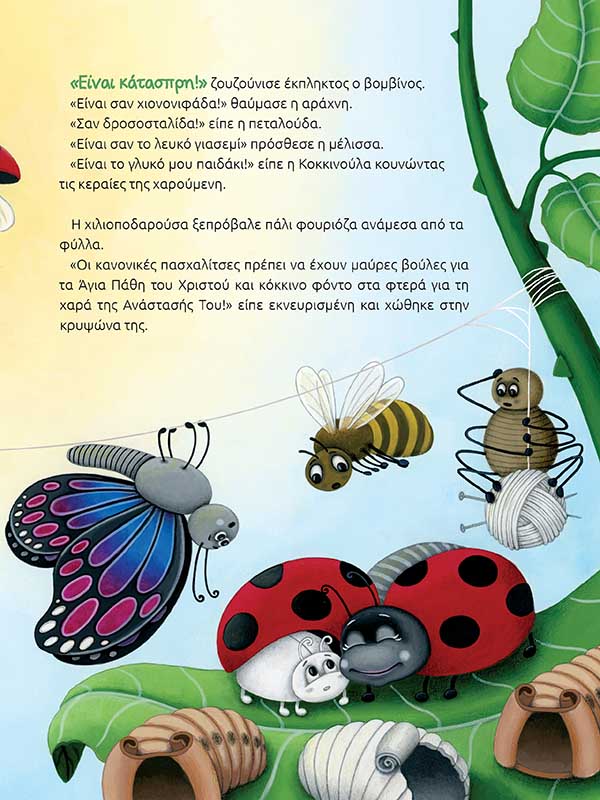 Το Πάσχα πλησιάζει και ο κήπος γεμίζει με τα χρώματα της άνοιξης! Όμως, μέσα σε αυτό το πανηγύρι των χρωμάτων κάνει την εμφάνισή της μια πασχαλίτσα λευκή. «Οι πασχαλίτσες είναι κόκκινες με μαύρες βούλες!» επιμένει η χιλιοποδαρούσα.