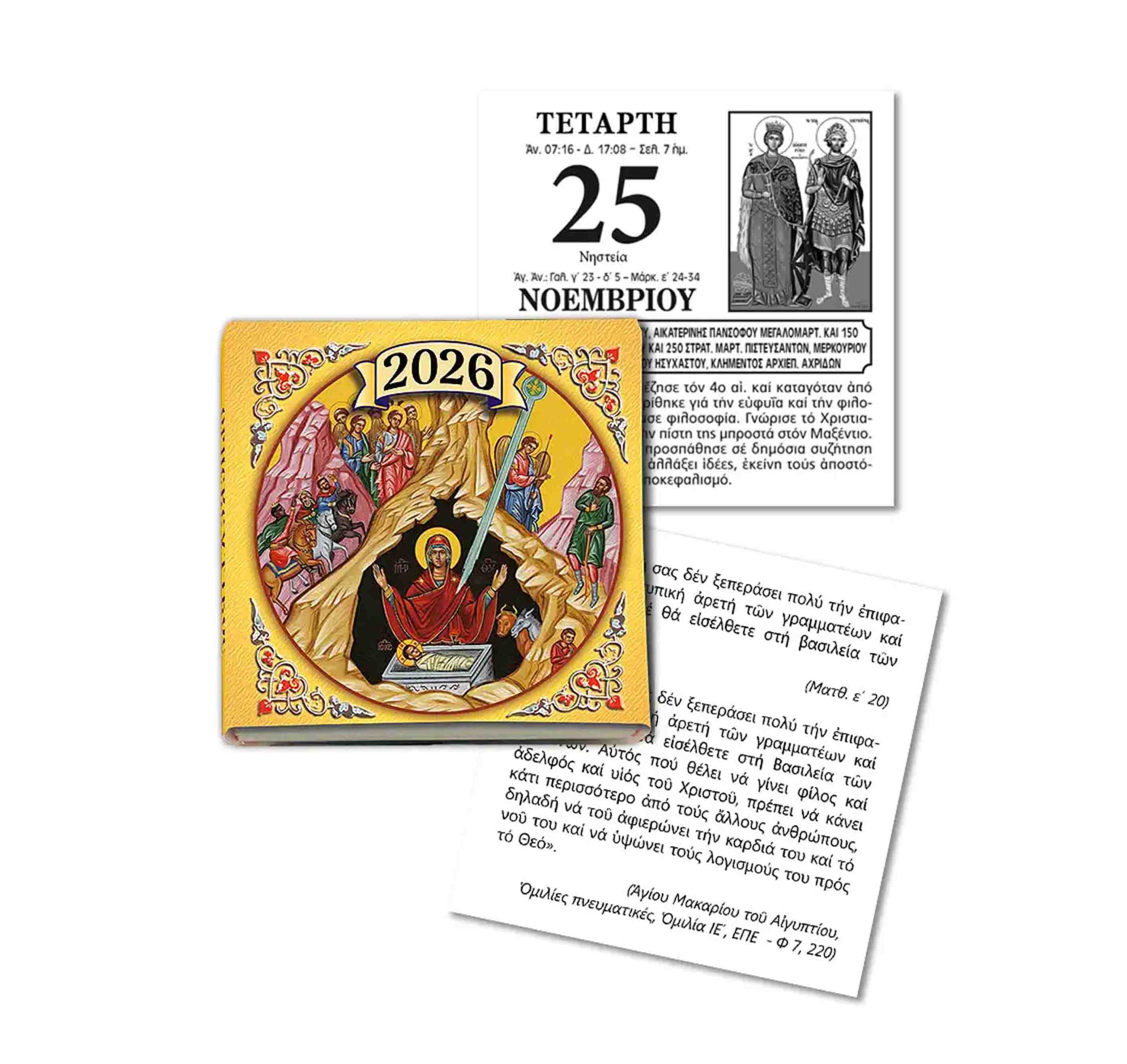 Ο μεγάλος ημερήσιος ημεροδείκτης (7×7) για τον τοίχο περιέχει στην α΄ όψη εικόνες, βίους Αγίων της ημέρας, νηστείες και αγιογραφικά αναγνώσματα. Στην β’ όψη αναγράφονται πατερικά κείμενα.