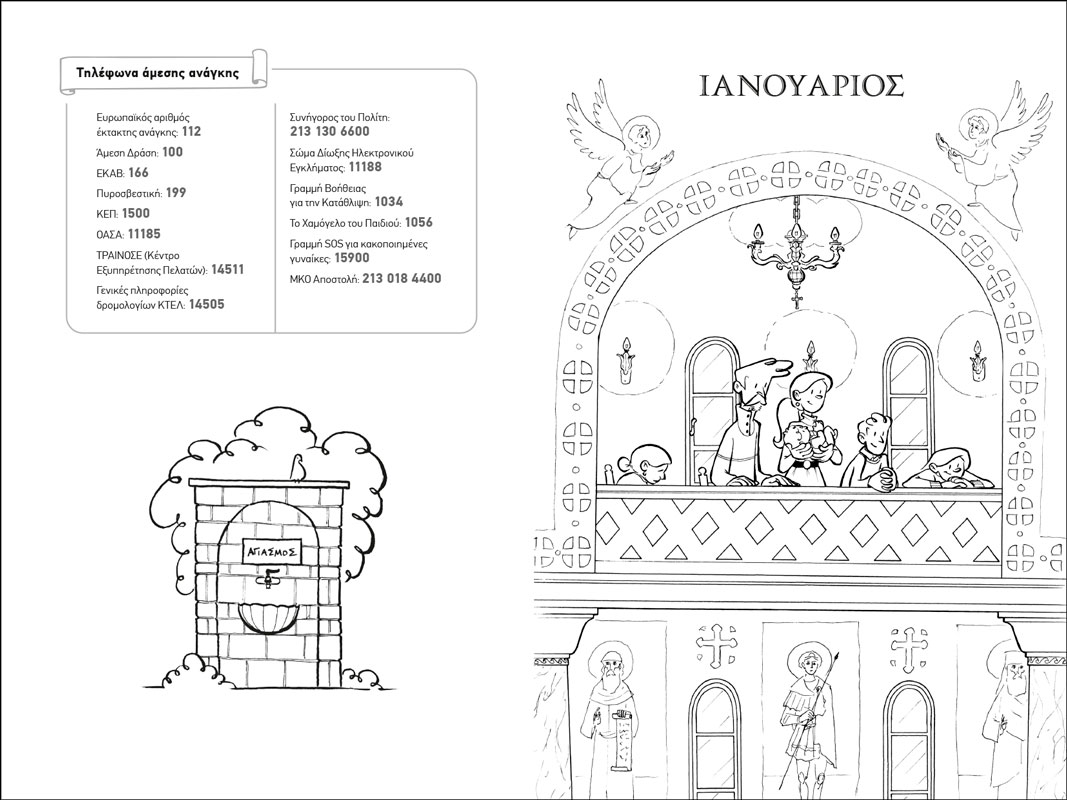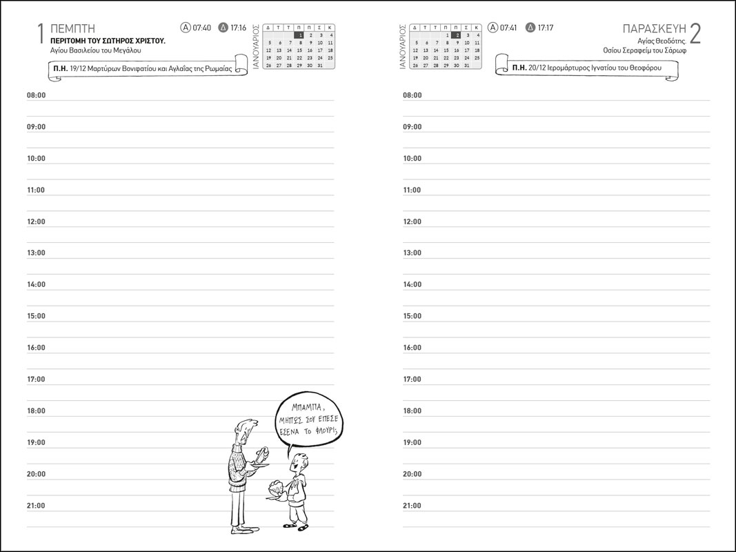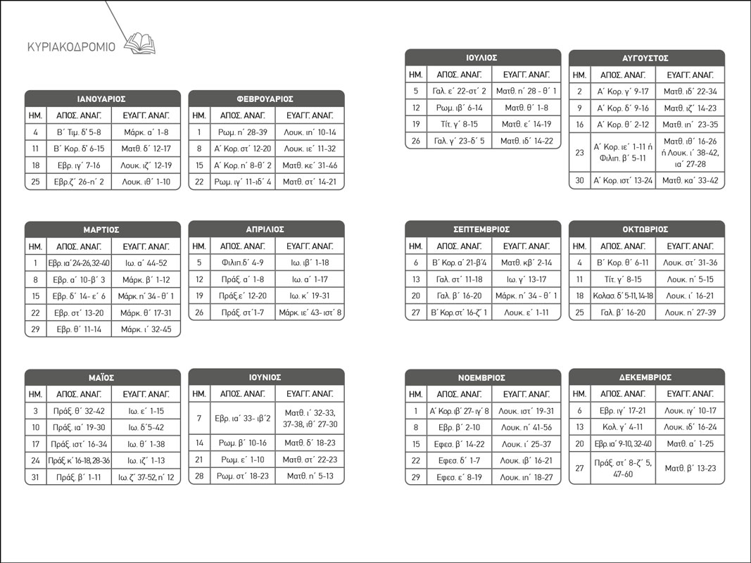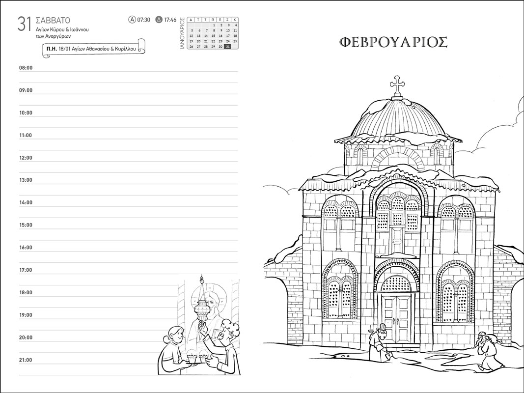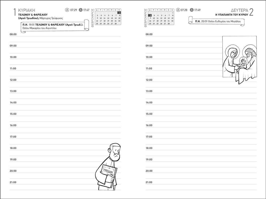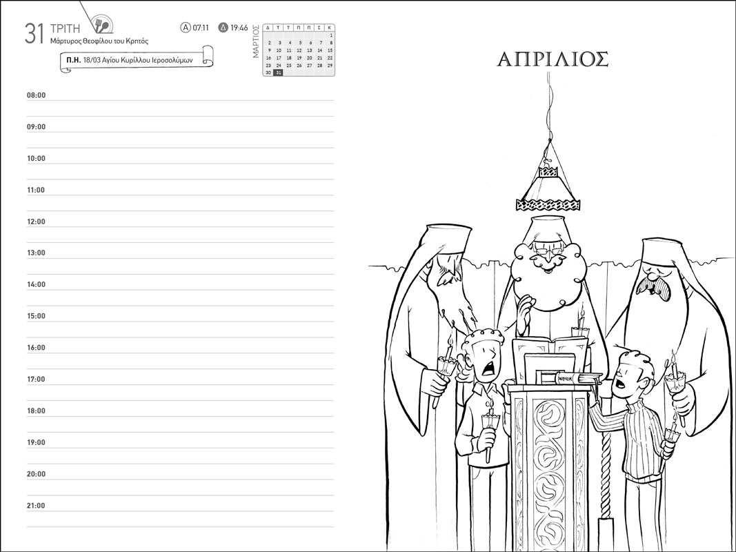 Ένα καθημερινό ΗΜΕΡΟΛΟΓΙΟ, κατάλληλο για Ιερείς, ψάλτες, αλλά και όποιον αναζητά την οργάνωση στη ζωή του. Περιέχει Κυριακοδρόμιο, καθημερινό αγιολόγιο, νηστείες και μεγάλο χώρο για σημειώσεις σε κάθε ημέρα. Τις σελίδες του ημερολογίου στολίζουν μικρά σκίτσα εμπνευσμένα από την εκκλησιαστική και μοναστική ζωή, που θα χαρίσουν στιγμές χαράς και θα κάνουν πράξη το αγιογραφικό “Χαίρετε εν Κυρίω”.