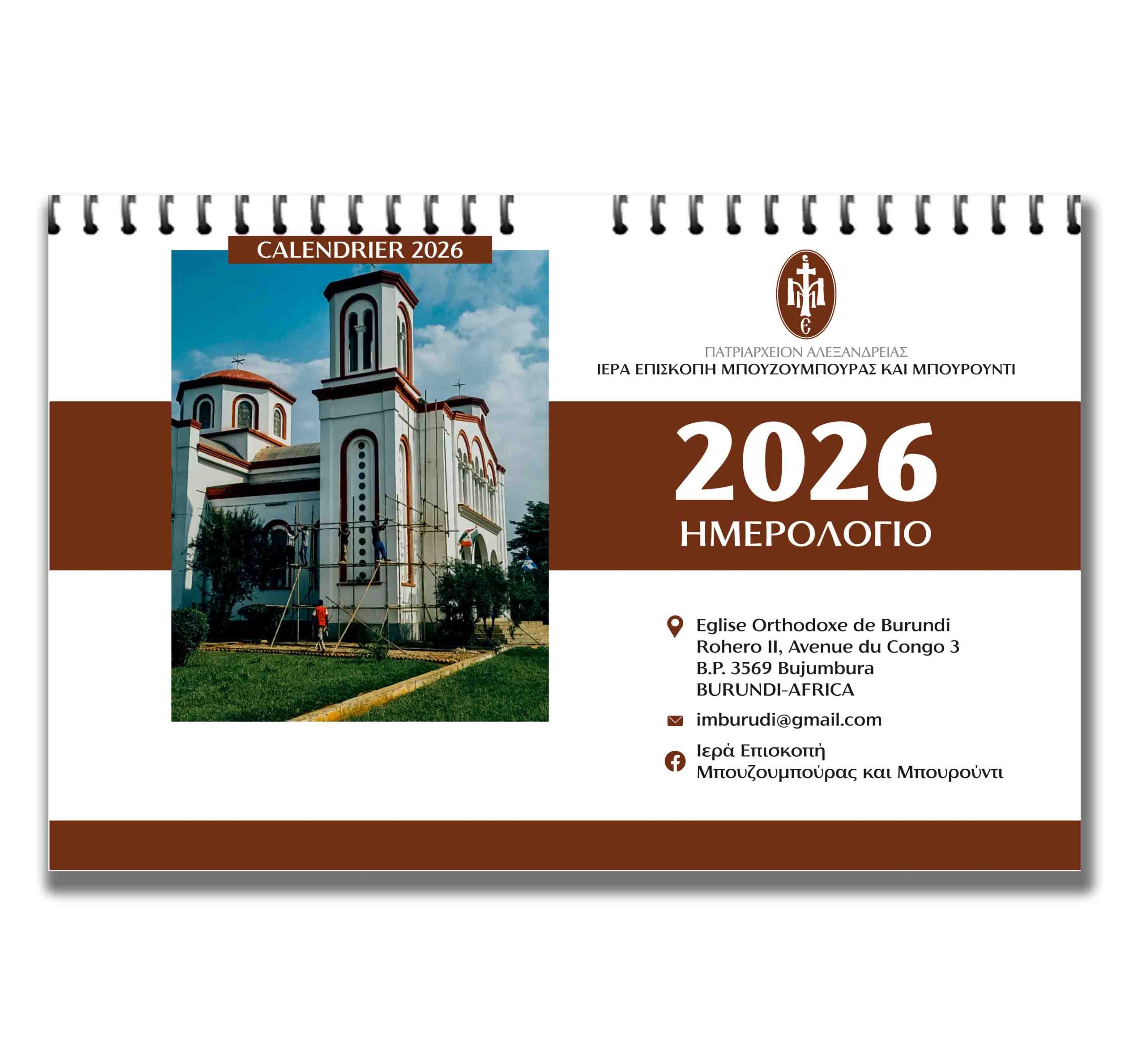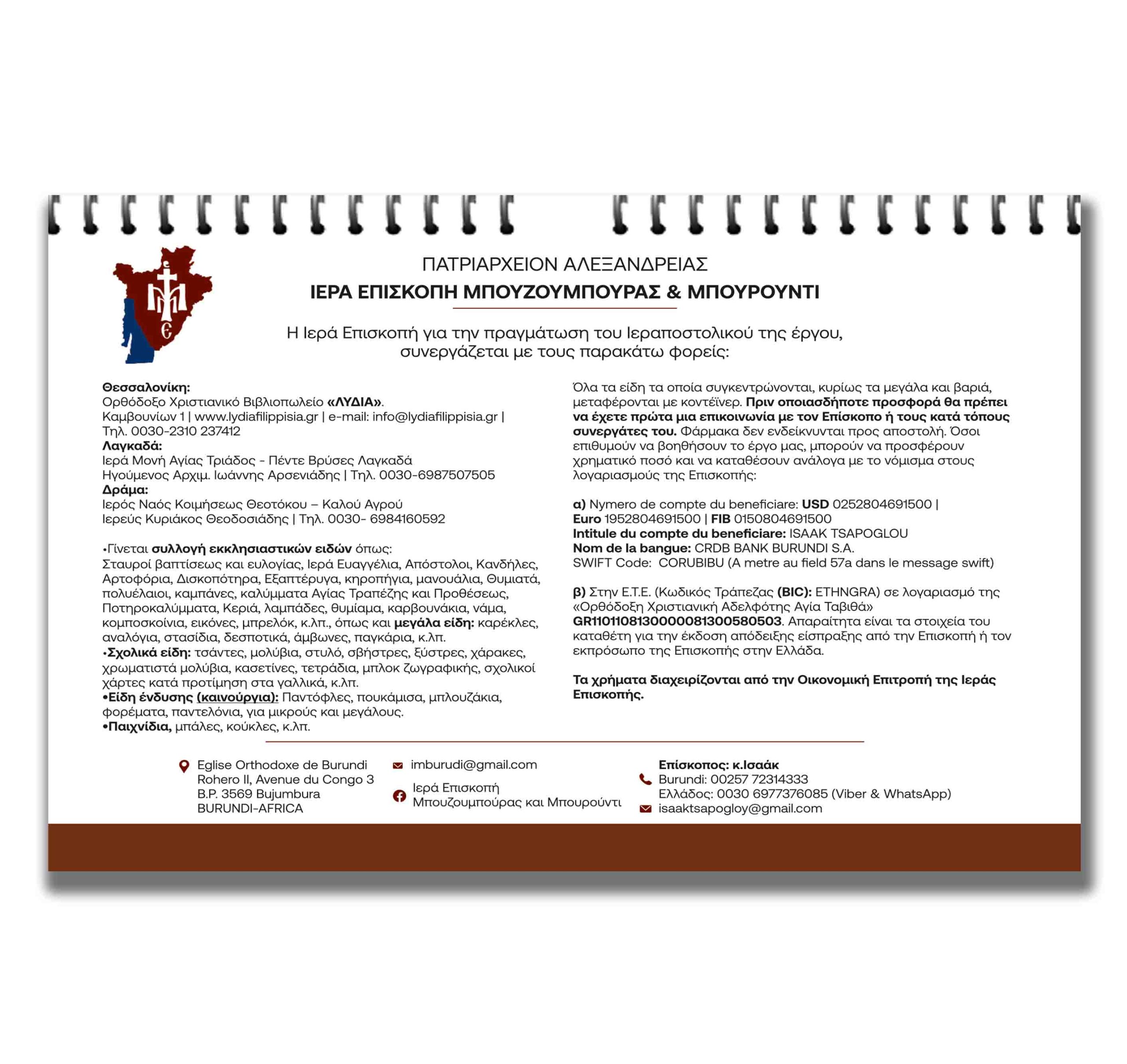 Αγοράζοντας ένα ημερολόγιο της Ιεράς Επισκοπής Μπουζουμπούρας και Μπουρούντι ενισχύετε το έργο του Ιεραποστολικού κλιμακίου, που τελείται με την ευλογία του Θεοφιλεστάτου Επισκόπου Μπουρούντι κ. Ισαάκ, στην πιο φτωχή χώρα της Αφρικής.