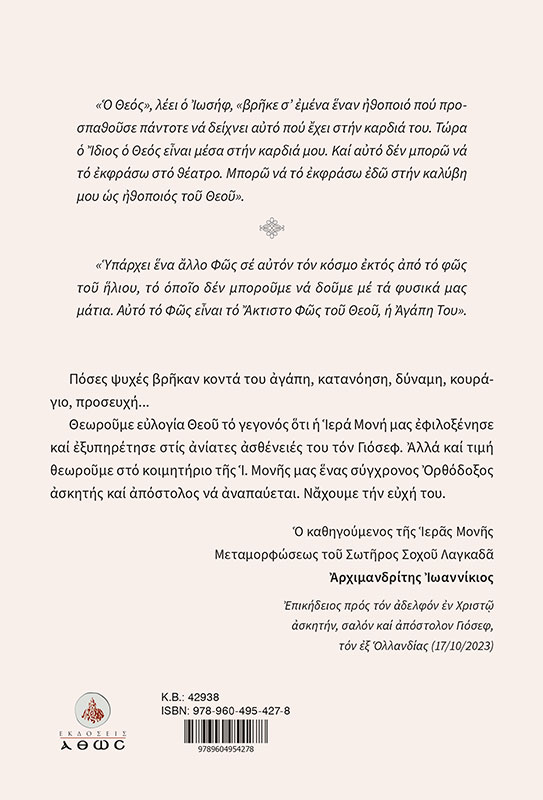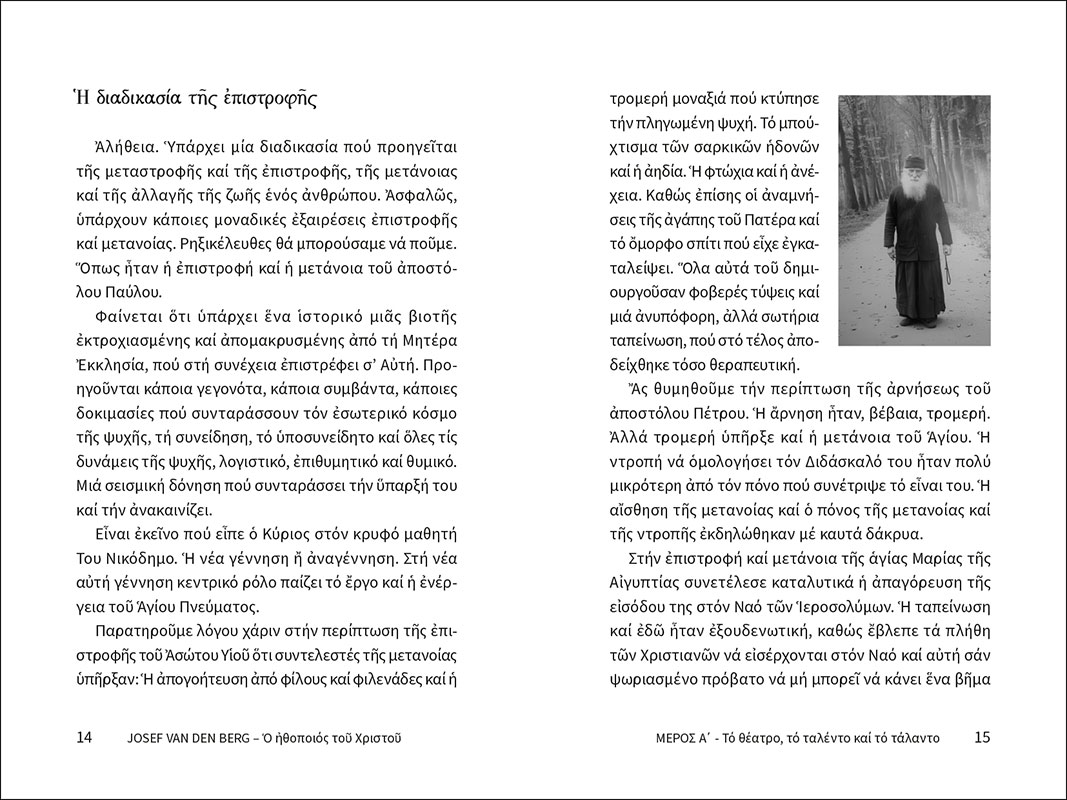 Ένα σπάνιο βιβλίο – ντοκουμέντο: η πορεία ζωής του επιτυχημένου Ολλανδού ηθοποιού Γιόζεφ βαν ντεν Μπεργκ, που έζησε τη συγκλονιστική μεταστροφή του στην Ορθοδοξία και εκοιμήθη στο μοναστήρι της Μεταμορφώσεως Σοχού Θεσσαλονίκης ως ασκητής. Στο βιβλίο παρακολουθούμε τα διάφορα στάδια της ζωής του στο πρώτο κεφάλαιο, στο δεύτερο κεφάλαιο θα διαβάσουμε συγκλονιστική, πνευματοφόρα αποσπάσματα του προσωπικού του ημερολογίου και στο τρίτο κεφάλαιο θα βρούμε δημοσιεύματα σχετικά με αυτόν. Το βιβλίο κλείνει με ένα ένθετο έγχρωμων φωτογραφιών του ασκητή Γιόζεφ βαν ντεν Μπεργκ.