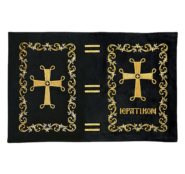 Βελούδινο κάλυμμα για το Ιερατικόν μεγάλου σχήματος των εκδόσεων της Αποστολικής Διακονίας της Εκκλησίας της Ελλάδος, με χρυσοκέντητο Σταυρό εντός πλαισίου.