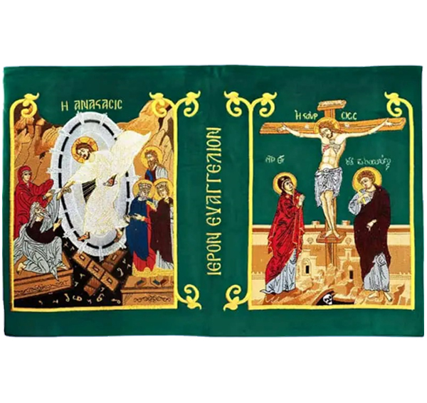 Χρυσοκέντητο εξωτερικό κάλυμμα του Ιερού Ευαγγελίου, μεγάλου μεγέθους των εκδόσεως της Αποστολικής Διακονίας της Εκκλησίας της Ελλάδος.