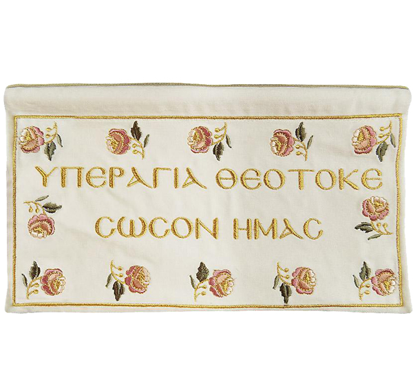 Λαβαράκι υφαντό-βελούδινο πάνω στο οποίο είναι κεντημένη με χρυσή κλωστή η προσευχή προς την Παναγία, «Υπεραγία Θεοτόκε σώσον ημάς», πλαισιωμένη από πλούσιο διάκοσμο με λουλουδάκια.