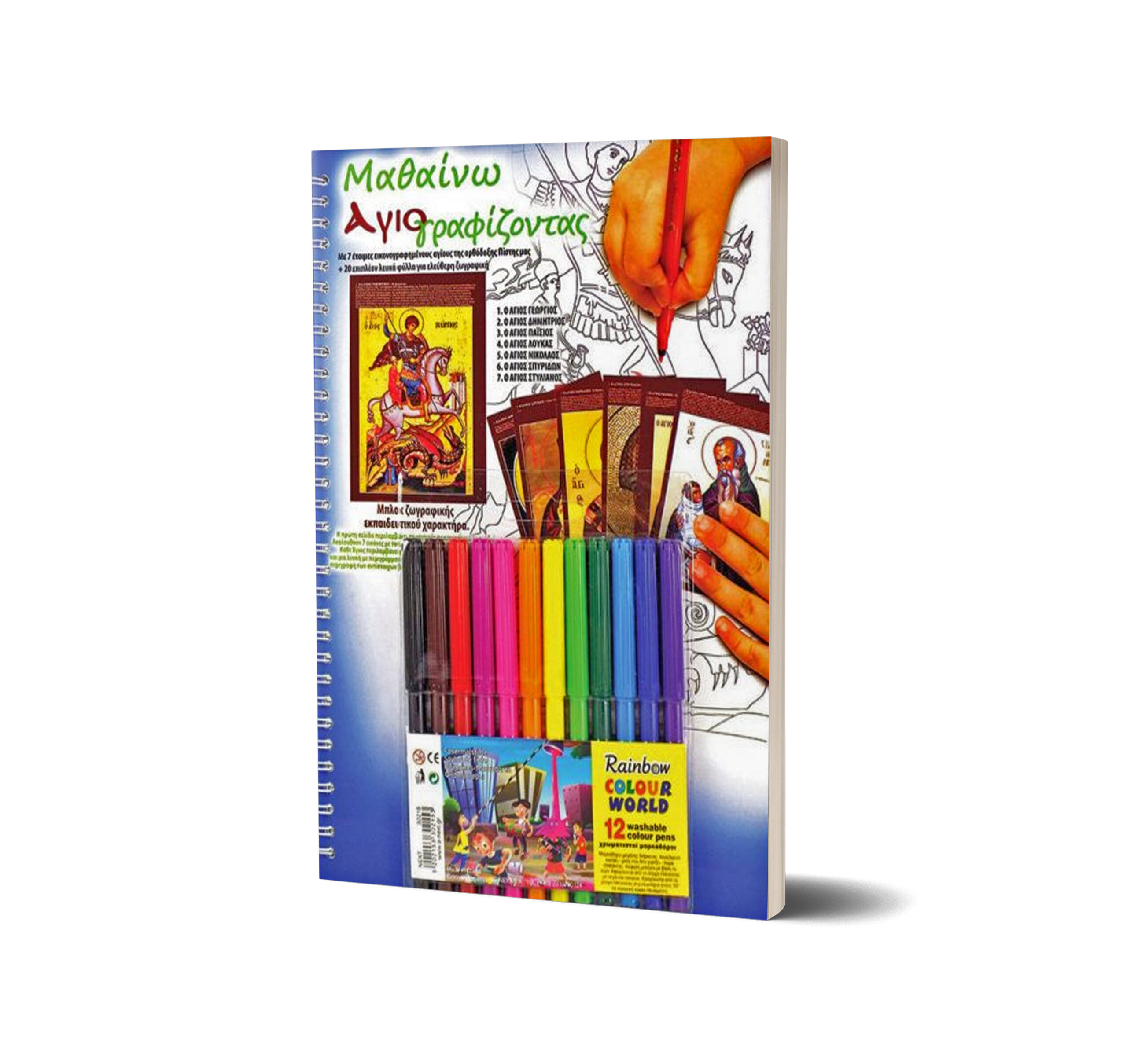 Εμπεριέχει περιγράμματα έτοιμων εικονογραφημένων εικόνων με Αγίους για εφαρμογή των χρωμάτων με έτοιμη έγχρωμη εικόνα ως πρότυπο.