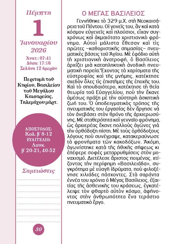 Ένα μοναδικό ημερολόγιο-αγιολόγιο που στόχο έχει να προβάλλει κάθε μέρα τη ζωή, την άσκηση, τον αγώνα, το μαρτύριο, τα θαύματα ενός από τους εορταζομένους αγίους.