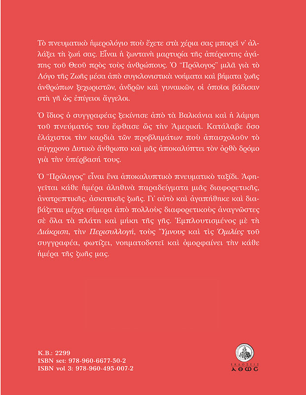 Ο “Πρόλογος” είναι ένα αποκαλυπτικό πνευματικό ταξίδι. Αφηγείται κάθε ημέρα αληθινά παραδείγματα μιας διαφορετικής, ανατρεπτικής, ασκητικής ζωής. Γι’ αυτό και αγαπήθηκε και διαβάζεται μέχρι σήμερα από πολλούς διαφορετικούς αναγνώστες σε όλα τα πλάτη και μήκη της γης. Εμπλουτισμένος με τη διάκριση, την περισυλλογή, τους ύμνους και τις ομιλίες του συγγραφέα, φωτίζει, νοηματοδοτεί και ομορφαίνει την κάθε ημέρα της ζωής μας. (Από την παρουσίαση στο οπισθόφυλλο του βιβλίου)