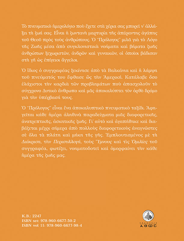 Το πνευματικό ημερολόγιο που έχετε στα χέρια σας μπορεί ν’ αλλάξει τη ζωή σας. Είναι η ζωντανή μαρτυρία της απέραντης αγάπης του Θεού προς τους ανθρώπους. Ο “Πρόλογος” μιλά για το Λόγο της Ζωής μέσα από συγκλονιστικά νοήματα και βήματα ζωής ανθρώπων ξεχωριστών, ανδρών και γυναικών, οι οποίοι βάδισαν στη γη ως επίγειοι άγγελοι.