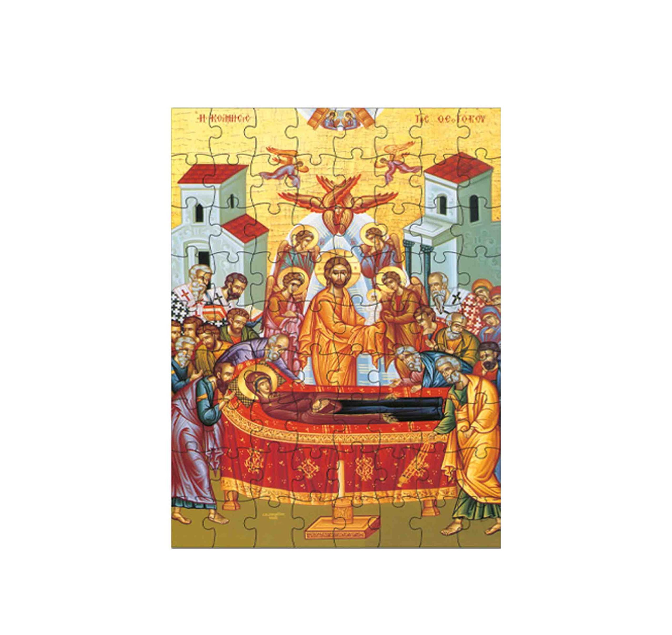 Παζλ για τις ώρες δημιουργικής απασχόλησης των παιδιών με απεικόνιση της «Κοιμήσεως της Θεοτόκου» το οποίο συνοδεύεται με κουτί συσκευασίας με απεικόνιση του θέματος.