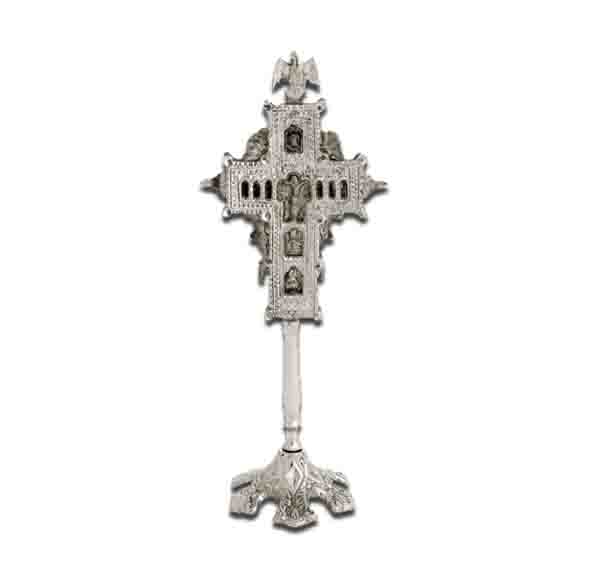 Σταυρός επινικελωμένος διπλός σκαλιστός, επιτραπέζιος, κατάλληλος και για χρήση στην Ιερά Ακολουθία του Αγιασμού.