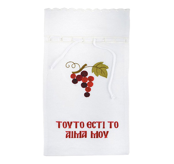 Κεντημένη βαμβακερή θήκη σε σχήμα πουγκιού για τη φύλαξη και τη μεταφορά του μπουκαλιού του Νάματος της Θείας Ευχαριστίας.