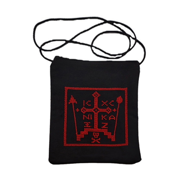 Κρεμαστή υφαντή θήκη λαιμού με το Μικρό Μοναχικό Σχήμα κεντημένο και τις λέξεις IC XC NIKA σε κόκκινο χρώμα πάνω  σε μαύρο ύφασμα.