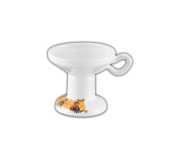 Κεραμικό θυμιατό πυρίμαχο, σε λευκό χρώμα, διακοσμημένο στη βάση του με μορφές Αγίων σε χρυσοτυπία και με λαβή.