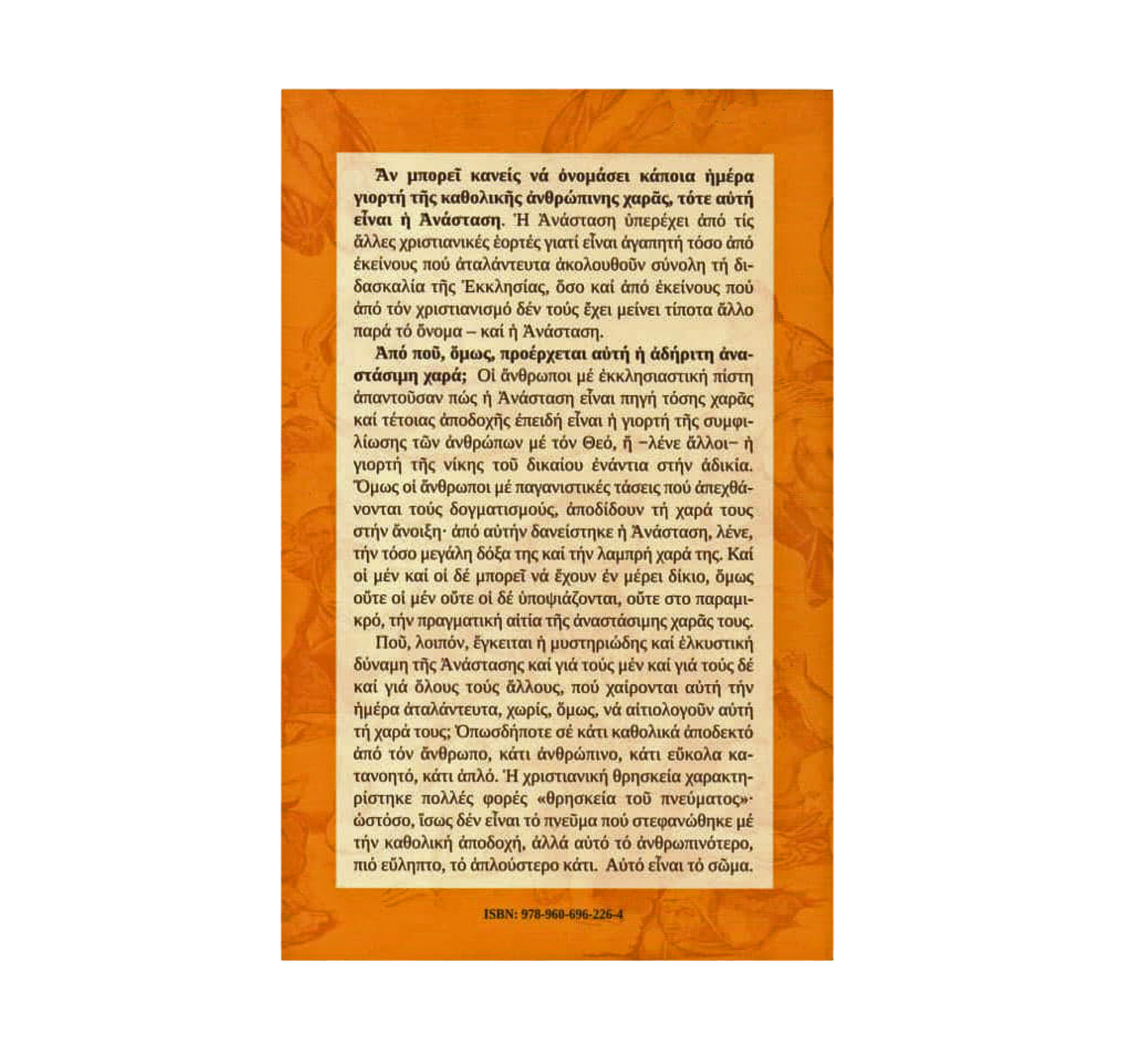 Από πού, όμως, προέρχεται αυτή η αδήριτη αναστάσιμη χαρά; Οι άνθρωποι με εκκλησιαστική πίστη απαντούσαν πως η Ανάσταση είναι πηγή τόσης χαράς και τέτοιας αποδοχής επειδή είναι η γιορτή της συμφιλίωσης των ανθρώπων με τον Θεό, ή -λένε άλλοι- η γιορτή της νίκης του δικαίου ενάντια στην αδικία. Όμως οι άνθρωποι με παγανιστικές τάσεις που απεχθάνονται τους δογματισμούς, αποδίδουν τη χαρά τους στην άνοιξη από αυτήν δανείστηκε η Ανάσταση, λένε, την τόσο μεγάλη δόξα της και την λαμπρή χαρά της. Και οι μεν και οι δε μπορεί να έχουν εν μέρει δίκιο, όμως ούτε οι μεν ούτε οι δε υποψιάζονται, ούτε στο παραμικρό, την πραγματική αιτία της αναστάσιμης χαράς τους.