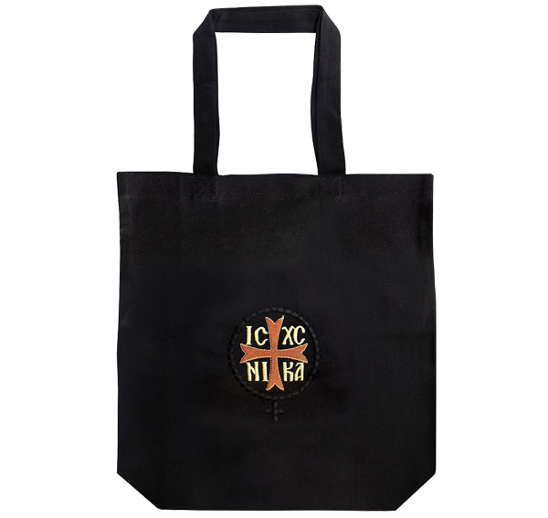 Τσάντα υφασμάτινη κεντητή μαύρου χρώματος με το σύμβολο που απεικονίζεται ο Σταυρός, το κομποσκοίνι και το ΙC ΧC ΝΙΚΑ.