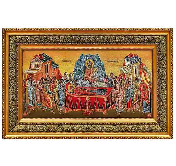 Υφαντή μεγάλη εικόνα με κορνίζα “Η Κοίμησις της Θεοτόκου” – 45 Χ 75 εκατοστά